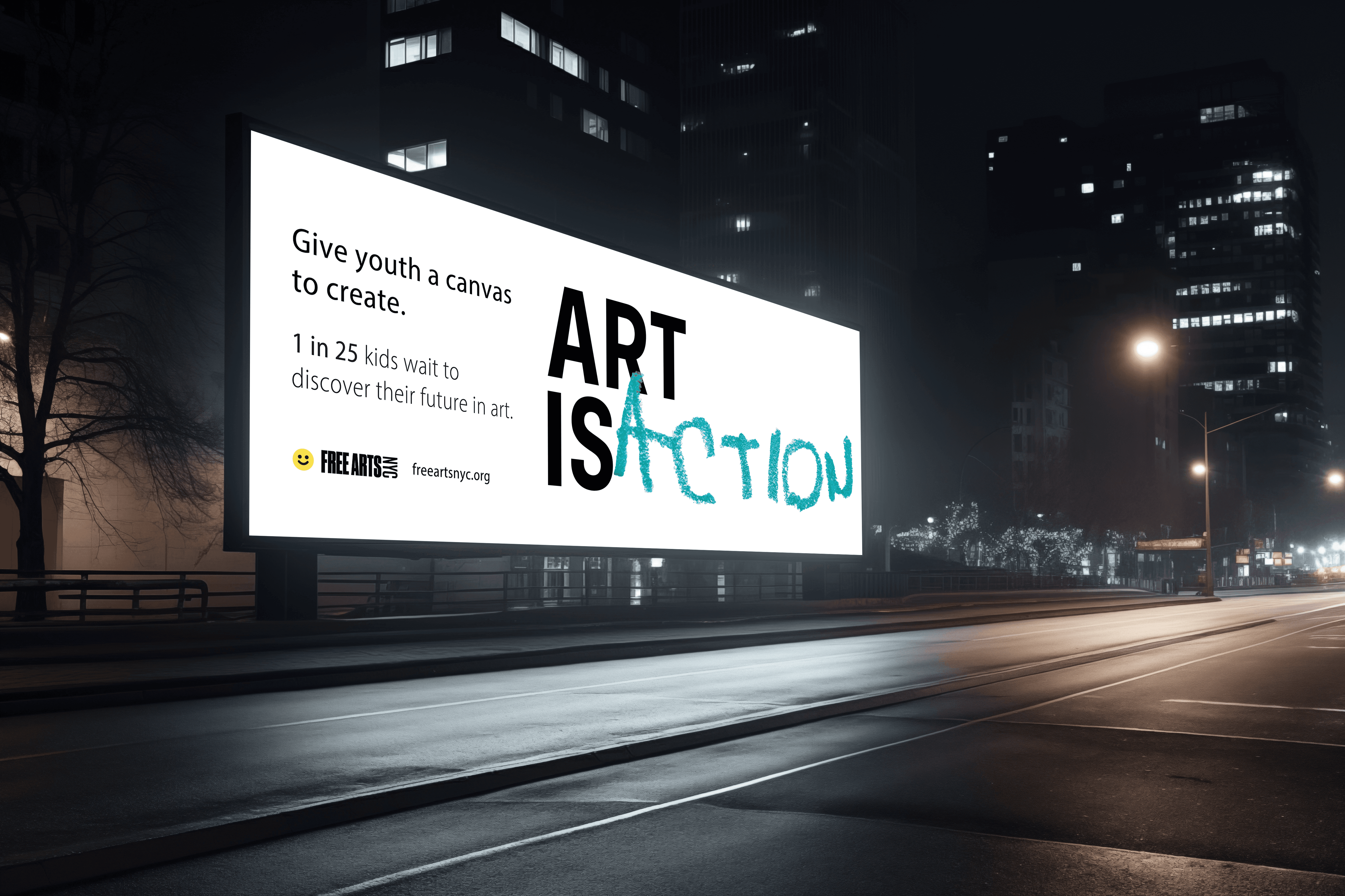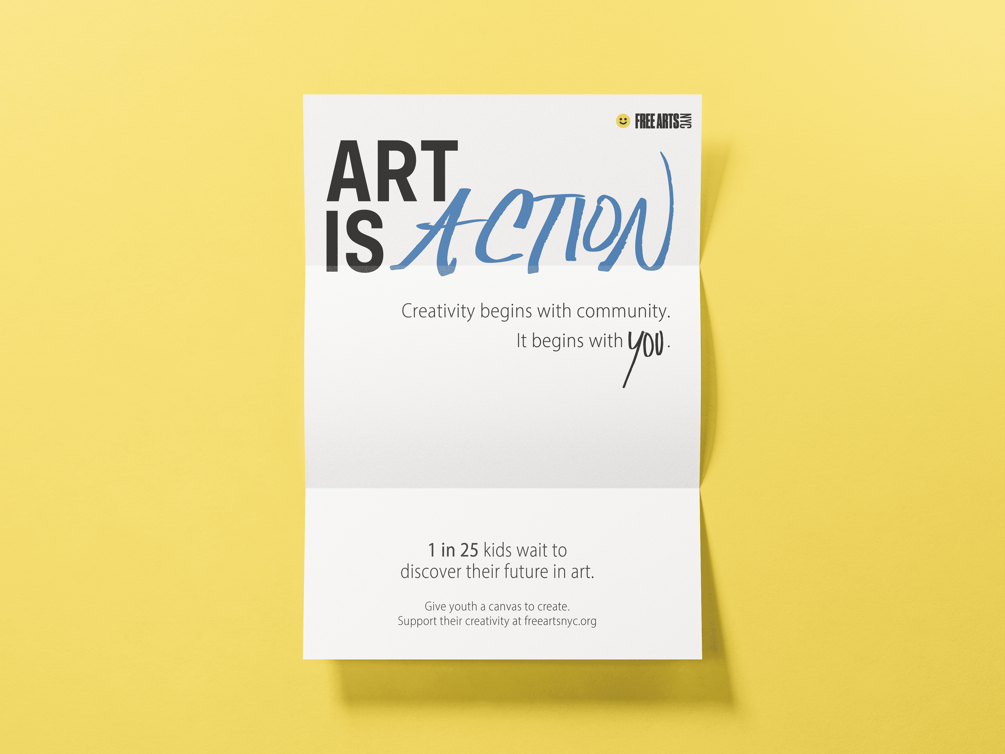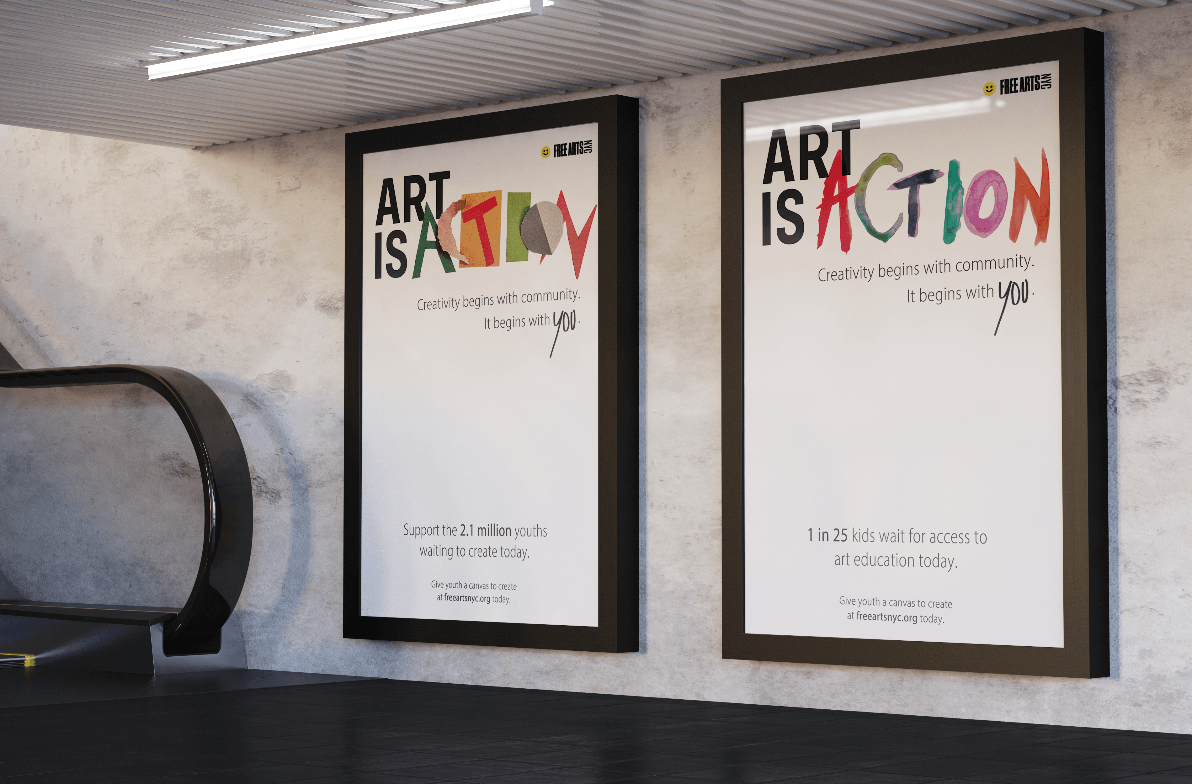 Art is Action is an attention grabbing cause marketing campaign bringing light to children without access to art education. This campaign makes people aware of their power to change youth’s lives, and offers them a feeling of purpose and resolve as well as a place to donate. With the use of multiple traditional mediums and bold typography/layouts, these decisions are meant as a way to reach out to all artists and creatives to help support their community as well as passersby who walk past.